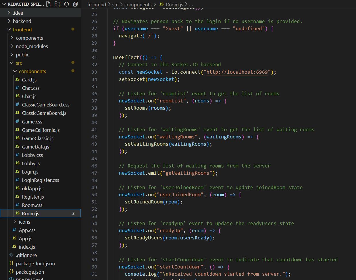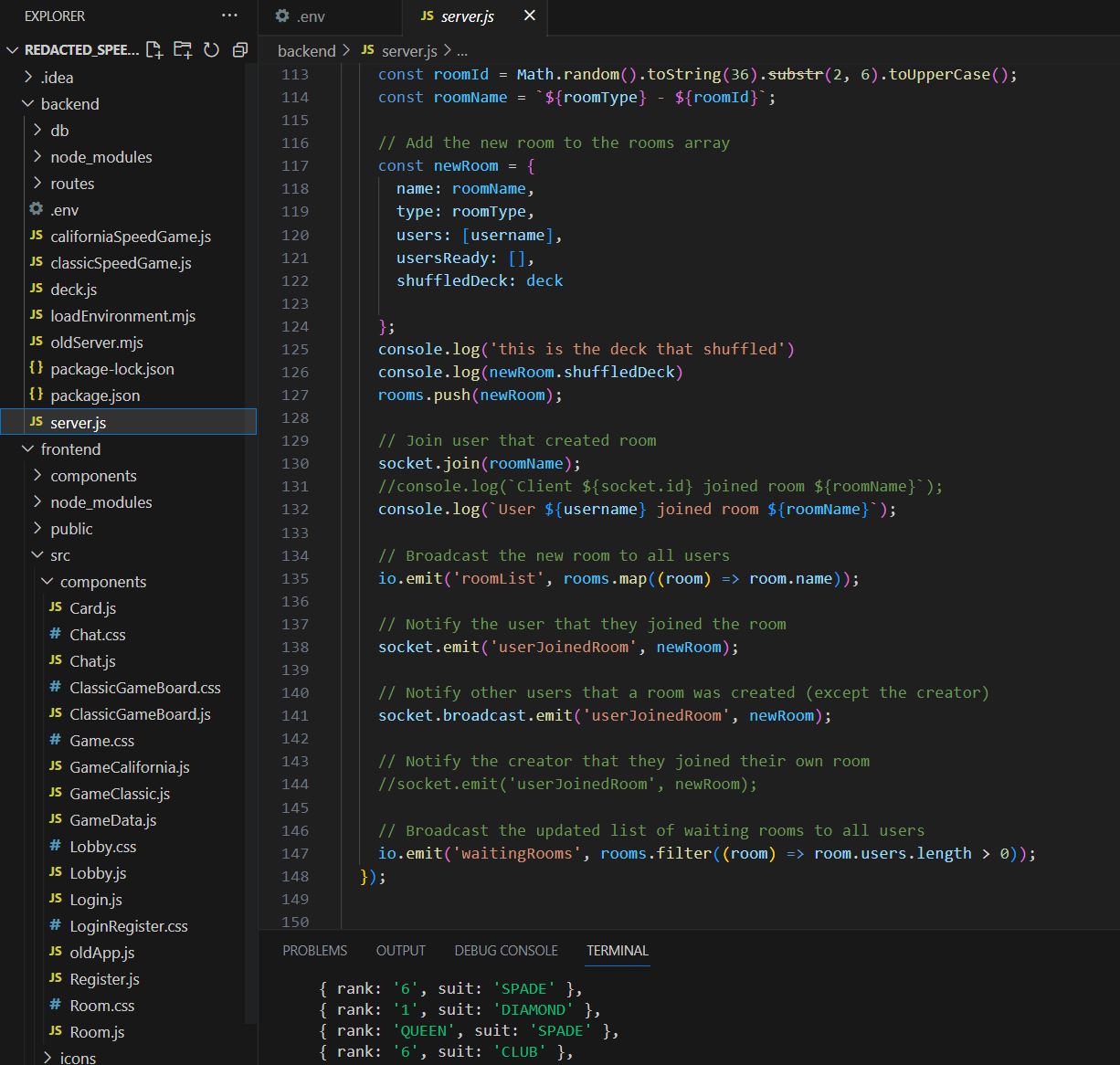 This was a final group project for a client. Our group name was Redacted and consisted of four members. We were tasked to create a web based card game application using MongoDB, Express.js, React, Node.js. The application was a Speed Game and a California Speed Game. This application would consist of a login page, a lobby, chat messaging, and a breakout game room where users may join to play. This project combined all previous technologies into a single cohesive speed game application.